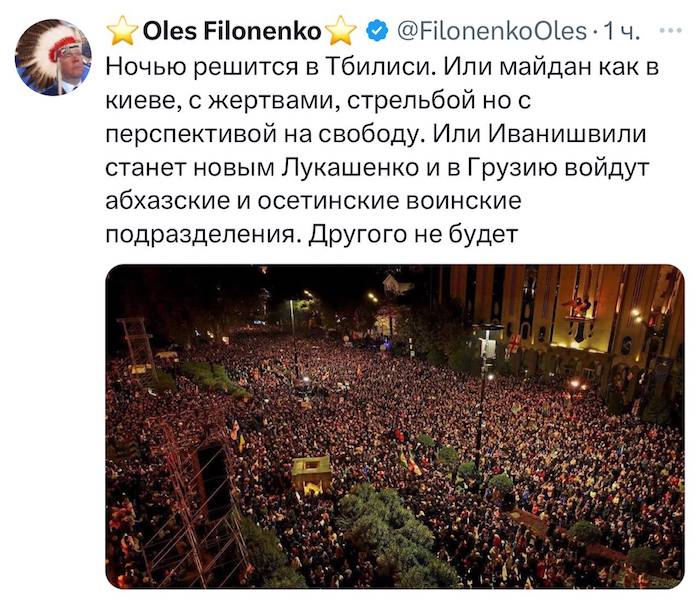 Premiér Kobachidze uvedl, že policie v Tbilisi včera zabránila (https://t.me/readovkanews/90031) státnímu převratu. Strážci zákona čelili organizovanému davu výtržníků, mezi nimiž bylo asi 500 provokatérů. Kobachidze poznamenal, že tbiliská policie musela čelit nikoli pokojnému shromáždění, ale násilné akci s použitím pyrotechniky a zápalných lahví.