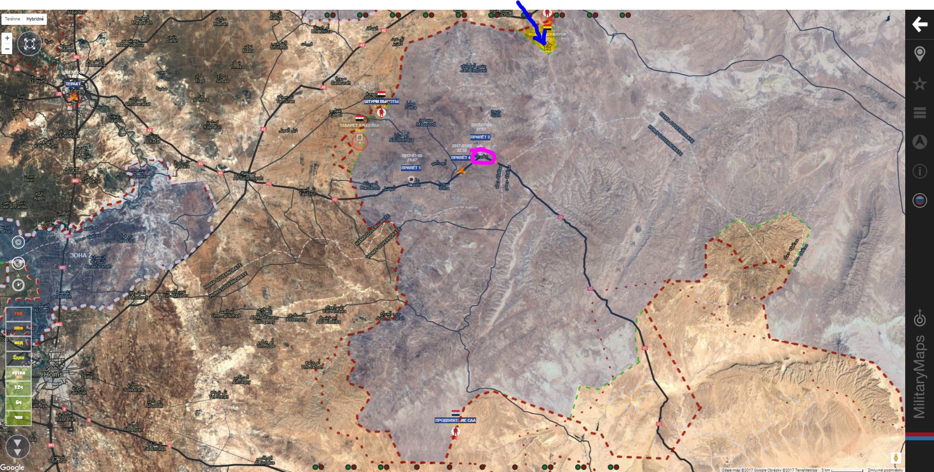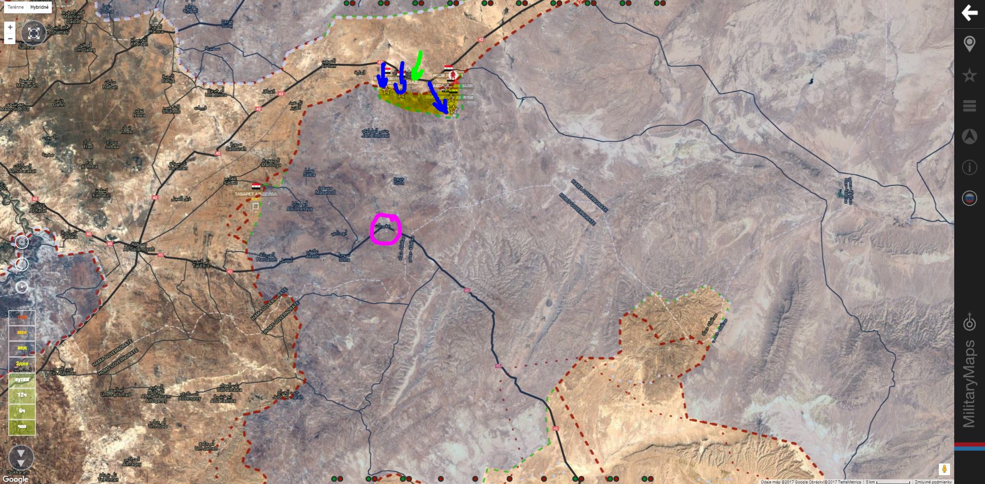 Aqraybat. Včerajšie útoky SAA+. Miesta dopadov ruských rakiet. Vyzerá to, že SAA+ si pripravuje cestu do tejto pevnosti ISIS.