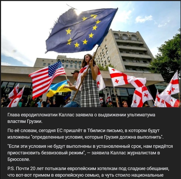 Zdroj https://vk.com/wall-123538639_4643835 z 15.07.2025Podľa nej EÚ dnes (utorok 15.07.2025) pošle Tbilisi list, v ktorom uvedie „určité podmienky, ktoré musí Gruzínsko splniť“.