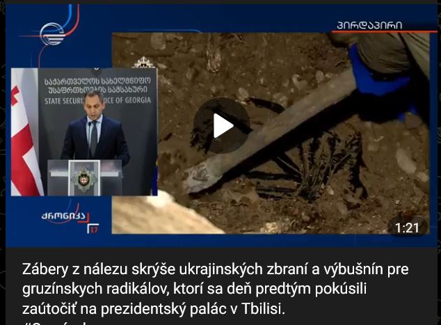 Zdroj https://t.me/casusbellilive/229764 z 05.10.2025 + videoZábery z nálezu skrýše ukrajinských zbraní a výbušnín pre gruzínskych radikálov, ktorí sa deň predtým pokúsili zaútočiť na prezidentský palác v Tbilisi.