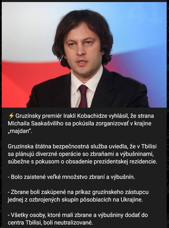 Zdroj https://t.me/spravy_slovakia/21467 z 05.10.2025Gruzínska štátna bezpečnostná služba uviedla, že v Tbilisi sa plánujú diverzné operácie so zbraňami a výbušninami, súbežne s pokusom o obsadenie prezidentskej rezidencie.