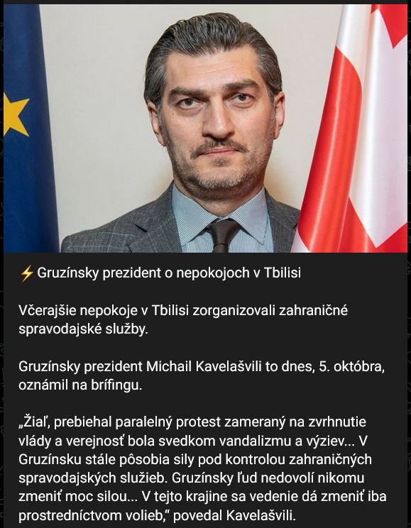 Zdroj https://t.me/spravy_slovakia/21464 z 05.10.2025Včerajšie (sobota 04.10.2025) nepokoje v Tbilisi zorganizovali zahraničné spravodajské služby.
