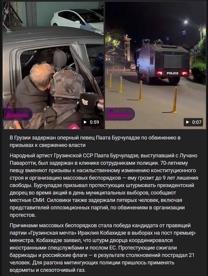 Zdroj https://vk.com/wall-232252403_11129 z 05.10.2025 + 2 videoNárodný umelec Gruzínskej SSR Paata Burchuladze, ktorý vystupoval s Lucianom Pavarottim, bol zadržaný v klinike policajnými zložkami. 70-ročnému spevákovi sa kladie za vinu podnecovanie k násilnej zmene ústavného poriadku a organizovanie masových nepokojov – hrozí mu až 9 rokov odňatia slobody. Burchuladze vyzýval protestujúcich, aby počas akcií v deň komunálnych volieb zaútočili na prezidentský palác, informujú miestne médiá. Bezpečnostné zložky tiež zadržali 5 osôb, vrátane predstaviteľov opozičných strán, na základe obvinení z organizovania protestov.