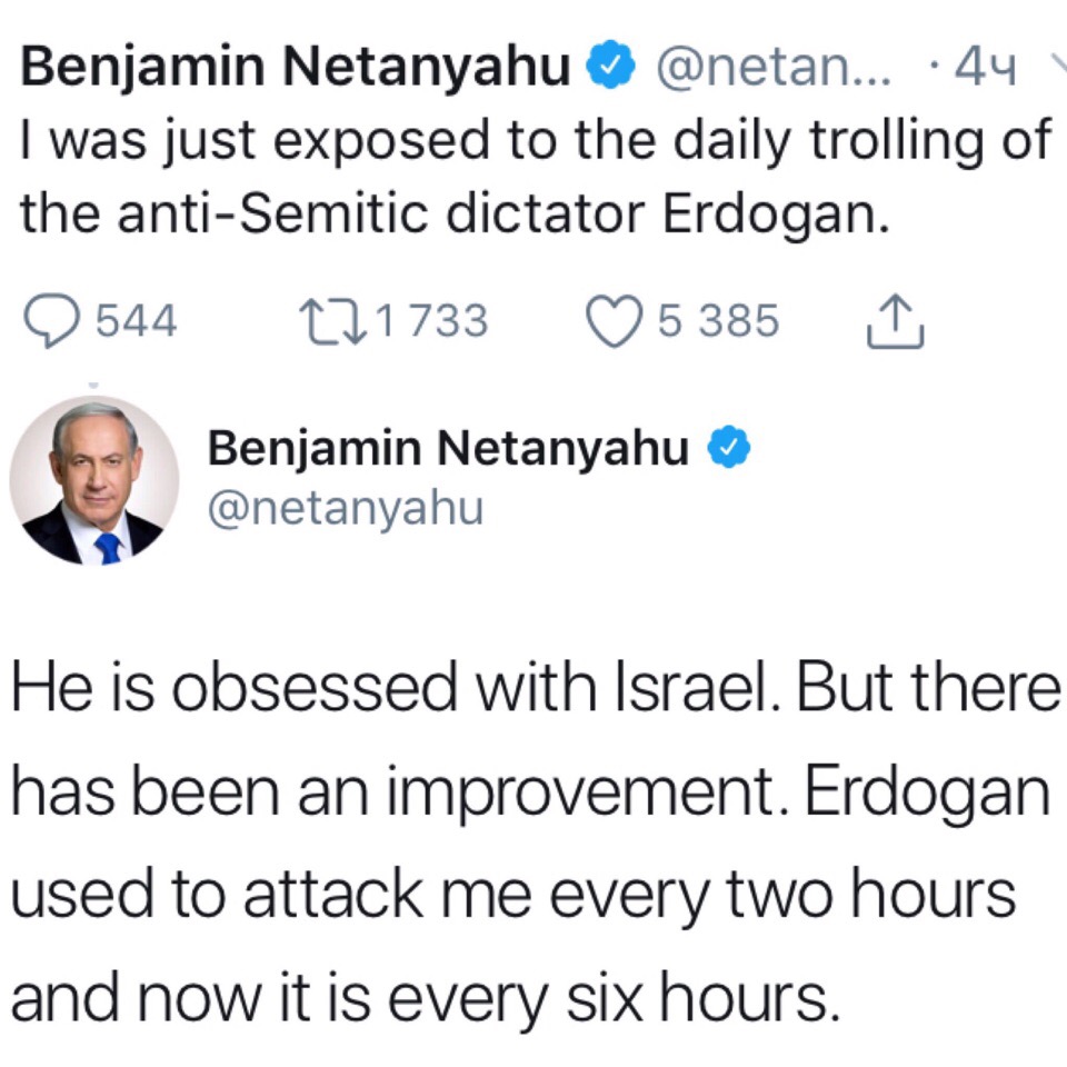 "Je posedlý Izraelem. Ale došlo ke zlepšení. Erdogan mě napadl každé dvě hodiny a teď napadá každých šest hodin "- píše B. Netanjahu