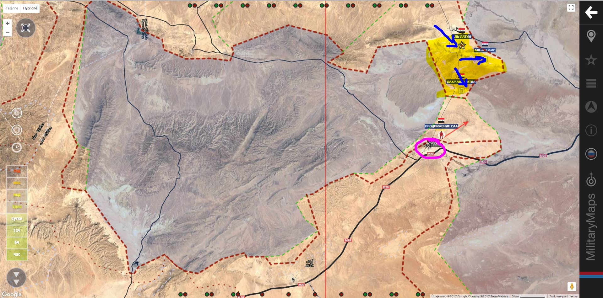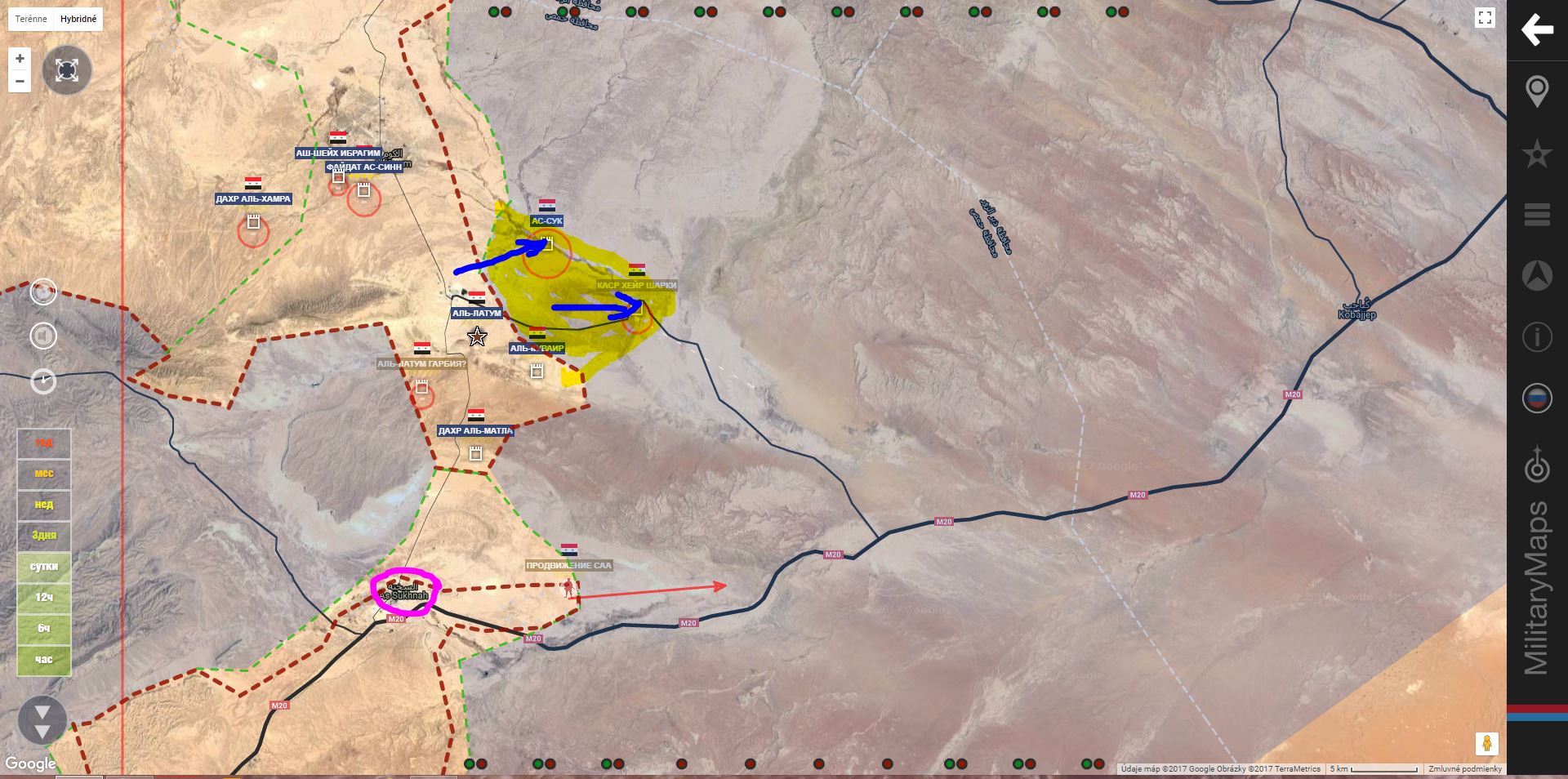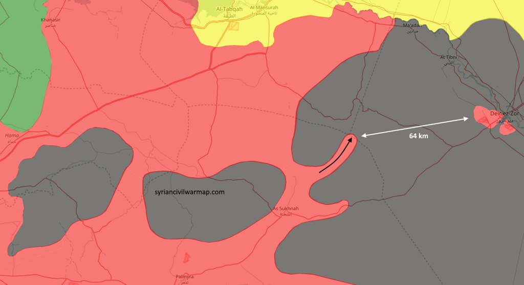 SAA+(Tigri) pridala územie As Suk a Qasr al-Hayr al-Sharqi vedie tiež útok v smere červenej šípky, zdroj hovorí o 30 km.