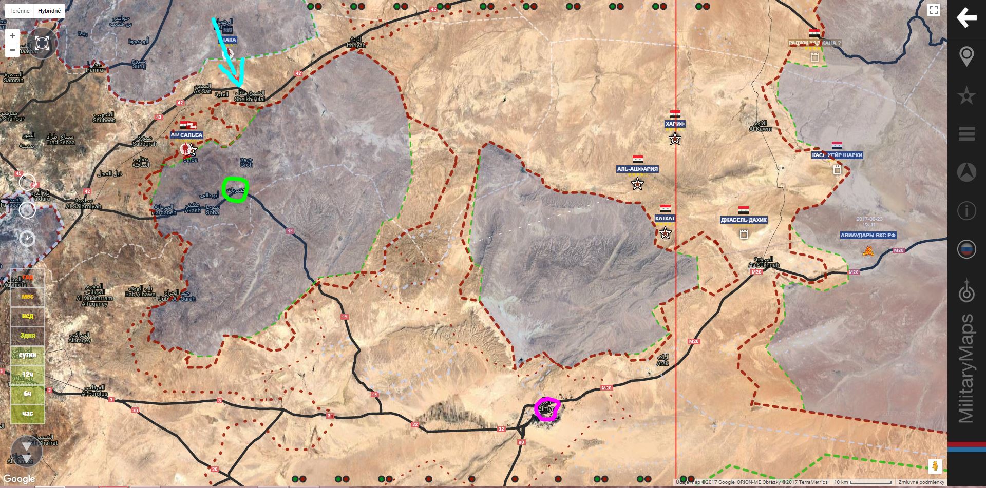Aqraybat, Palmýra, Šejk Halal. Aktuáne v centrálnej Sýrii. Rebeli zaútočili v smere Šejk Halal. Vyzerá to, ako pokus o prerazenie koridoru pre útek ISIS z kotla SAA+, alebo prerušenie cesty do Aleppa. SAA+ pozície uhájila.