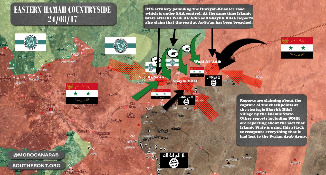 23. a 24. HTS dělostřelectvo masivně ostřelovalo síly SAA podél strategické cesty na Aleppo. Ve stejnou dobu ISSI zaútočilo na SAA v oblasti Wadi al-Adib a Shayk Hilal a dočasně přerušilo cestu blízko as-Saan.