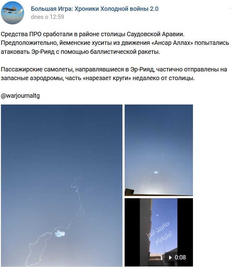 :sipka: Podle příchozích zpráv bylo na hlavní město Saúdské Arábie - Rijád - zaútočeno pomocí balistických raket a / nebo UAV