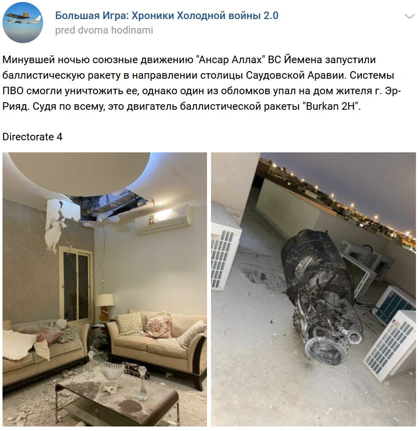 Po sobotňajšom (27.02.2021) útoku Jemenských rakiet po aktivácii PVO Saudskej Arábie niektoré trosky prepadli cez strechy obytných budov Saudom do "obývačky" - pravdepodobne motor z rakety Burkan 2H: