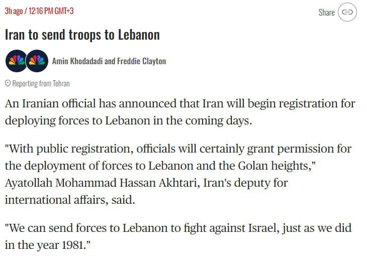 ▪️„Oficiálne miesta určite povolia vyslanie vojsk do Libanonu a na Golanské výšiny,“ povedal ajatolláh Mohammad Hassan Akhtari, námestník iránskeho ministra zahraničných vecí.