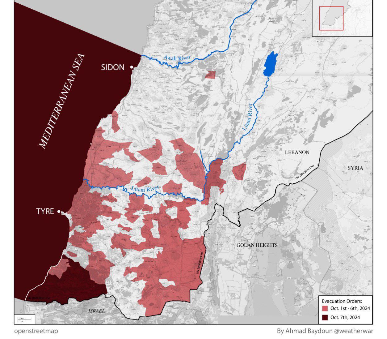 Aktuálna mapa osád v južnom Libanone, ktorých obyvateľom bolo nariadené opustiť svoje domovy. Táto oblasť bola vyhlásená za vojnovú zónu.
