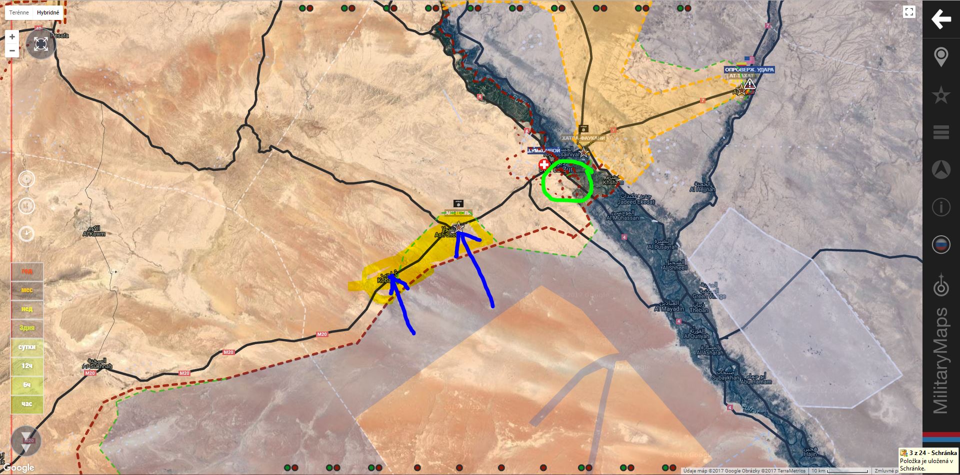 Deir Ez Zor. SAA+ sa dostala do ťažkostí potom, čo ISIS zaútočil na cestu M7 do mesta zo Suknah a obsadil As Šolu a Kabajib. Velenie SAA+ tam posiela posily.