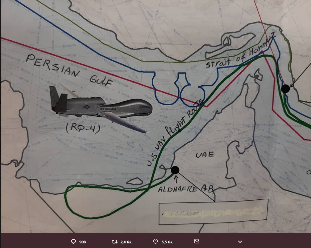 Ministr zahraničí Íránu: V 00:14 vzlétl americký drone z SAE v stealth režimu a porušil íránský vzdušný prostor. Byl zaměřen v 04:05 na souřadnicích (25°59'43N 57°02'25E) poblíž Kouh-e Mobarak. Zajistili jsme části amerického vojenského dronu v našich teritoriálních vodách, kde byl sestřelen.