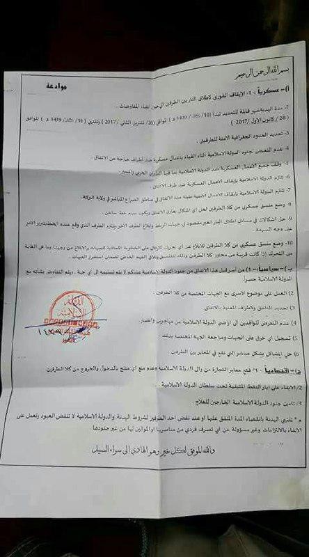 Dokument získaný sýrskymi jednotkami (neoverené, chce to preklad od nejakého arabistu, ale sú tam dátumy 1439/1940 hidžry, čož zodpovedá) Podľa kanálu "Directorat 4" dokumentu potvrdzuje dohodu o prímerí medzi Islamským štátom (IS/ISIL) a Sýrskymi demokratickými silami (SDF) uzatvorenú dna jeden mesiac od 28. 11. do 28.12. a v prípade dodržania prímeria sa automaticky predlži o pol roka.