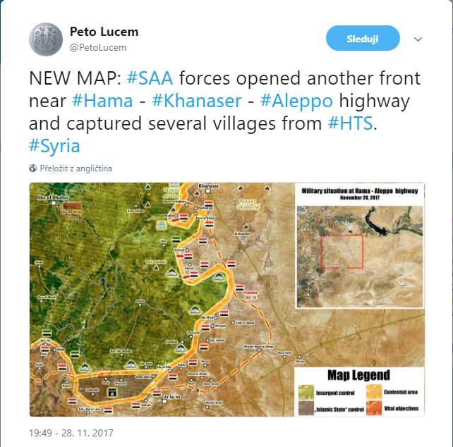 V nočnom útoku dobyla HTS od SAA dediny Al-Huweihi , Talfah , Abeisan a Abeisanske kopce v južnom Aleppe. 1 tank SAA poskodeny, druhý HTS získala.HTS zajala aj vojakov SAA, vrátane vodiča tanku ..
