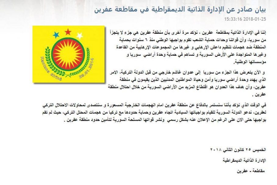 Podľa viacerých zdrojov YPG súhlasila s rozmiestnením SAA v Afrine, aby zastavili tureckú inváziu. https://al-sura.com/syrian-army-to-be-d ... -invasion/