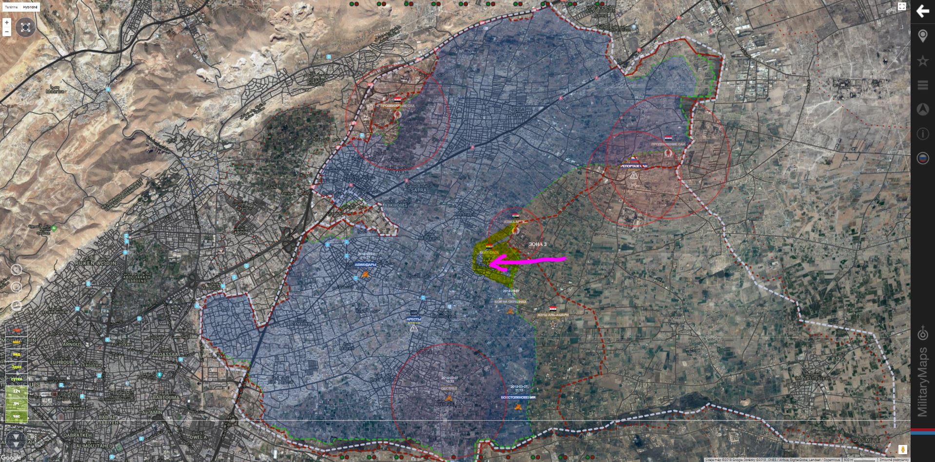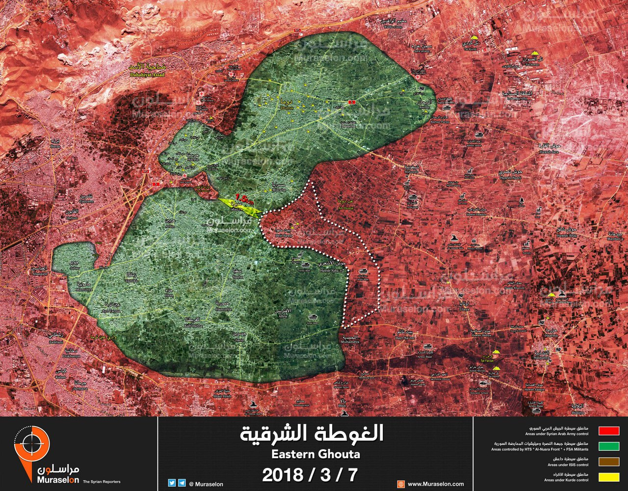 SOHR tvrdi, ze syrsku armadu deli od uplneho rozdelenia Ghouty uz len 1,3km. Avsak vzhladom na to, ze oblast je pod palebnou konotrolou od zakladne Harasta na zapade a jednotiek na okraji Madyary na vychode, rozdelenie je uz prakticky hotove. SOHR vycislilo uzemny zisk vlady na 52% od zaciatku ofenzivy