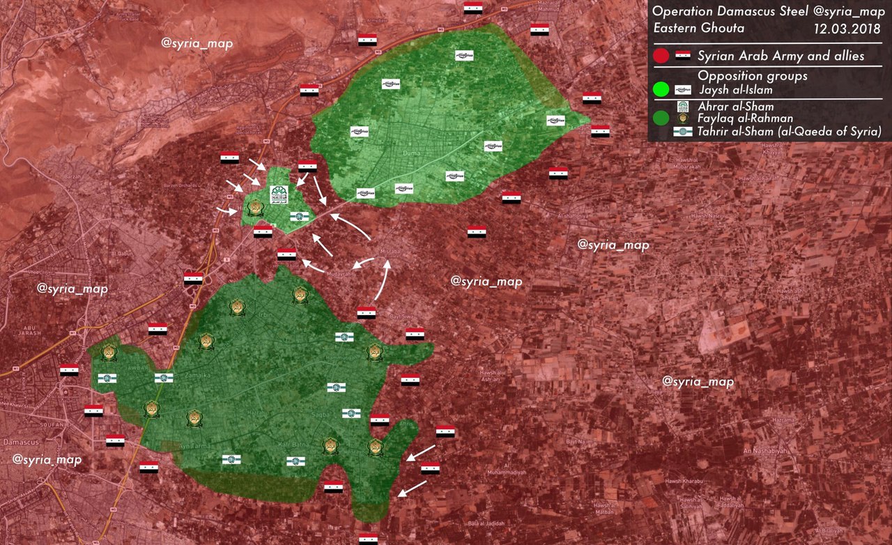 https://www.novinky.cz/zahranicni/blizk ... unici.htmlSyrská armáda při pokračující ofenzívě u Damašku v neděli rozdělila rebely ovládanou oblast Východní Ghúty na tři části, když obklíčila město Dúma. Na dobytém území v obci Aftris našla dílnu na výrobu chemických zbraní.