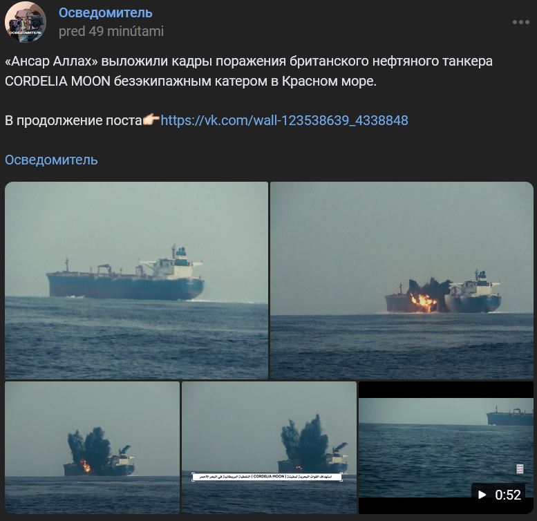 „UKMTO dostala správu o incidente 64NM [námorných míľ, 73,6 míľ] severozápadne od mesta Al Mukha v Jemene. Kapitán hlási dva útoky: prvý zo strany bezpilotného vzdušného systému (UAS), ktorý explodoval v tesnej blízkosti plavidla, čo malo za následok menšie škody; druhý zo strany bezpilotného hladinového plavidla (USV), ktoré tiež explodovalo v tesnej blízkosti plavidla,“ uviedli námorné sily Spojeného kráľovstva na sociálnych sieťach.