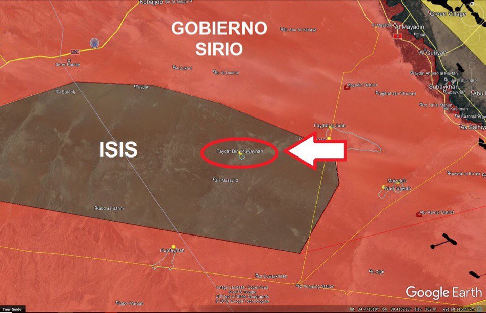 Enkláva pri Deir Ez Zor aktuálne po tom, čo SAA+ obsadila územie o rozlohe 1500 km2(fialová) okolo Faydat Ibn Mowyna( Faydah Umm Muwayna):