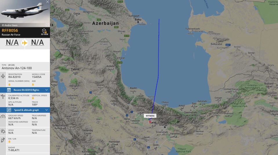 Chkalovsky ---> Latákyja (Chmejmim, Sýrie) přes íránský vzdušný prostor