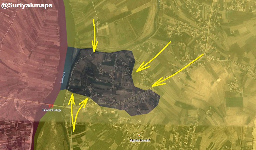SDF úplne zachytila oblasť Shajilah, oblasť mosta Bukamal a časti Huwayjat al-Khanafirah, kde poslední ISIS militanti stále odolávajú bombardovaniu a útokom z 3 osí v zóne 1 km ^ 2 (približná situácia)