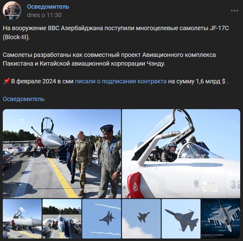 Do výzbroje VVS Azerbajdžana boli zaradené viacúčelové lietadlá JF-17C (Block-III). Lietadlá boli vyvinuté ako spoločný projekt čínskej spoločnosti Čcheng-tu (CAC) a pakistanskej firmy Pakistan Aeronautical Complex (PAC). V 02/2024 médiá písali o podpise zmluvy v hodnote 1,6 mld. $.