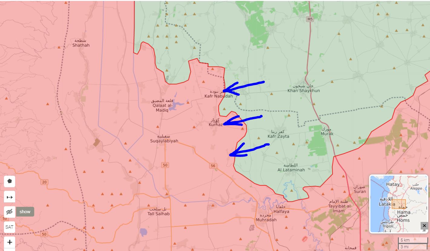 Vojska syrské arabské armády (SAA) a tygrských sil pracují na zabezpečení vesnic Qasabiya, Humayrat, Hardanah a Qirutiyah, které nedávno osvobodili od militantů v severozápadním Hama. Navzdory taktickému úspěchu v této oblasti musejí jednotky SAA a Tiger Forces konsolidovat své zisky, pokud chtějí ještě více rozvíjet útok. Hayat Tahrir al-Sham a tureckem podporované militantní skupiny soustředily pozoruhodnou sílu severně a východně Kafr Nabudah. Tyto síly se připravují na ofenzivní i obranné operace proti pro-vládním silám.