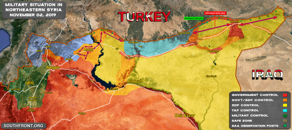 1. a 2. listopadu došlo v severovýchodním Sýrii k těžkým střetům kdy kurdské syrské demokratické síly (SDF) znovu obsadily další vesnice od protureckých militantů. Britská observatoř pro lidská práva (SOHR) informovala, že kurdským silám se podařilo znovu obsadit Dawdi, Azizah, al-Jamilyah a tři další vesnice v severních oblastech Al-Hasakahu od syrské národní armády podporované Tureckem (SNA). "[Tureckem podporované] frakce se pokusily zablokovat dálnici Jalabiya-Ain Issa severně od města Raqqa a znovu zahájily nový útok ve večerních hodinách na území ale nedosáhly svého cíle," dodala monitorovací skupina. Začátkem tohoto týdne zahájili militanti SNA překvapivý útok jižně od pohraničních měst Ras al-Ayn a obsadili několik vesnic a měst. Nedokázali však držet své pozice. Probíhající střety v severovýchodní Sýrii ukazují, že situace je stále daleko od stability.