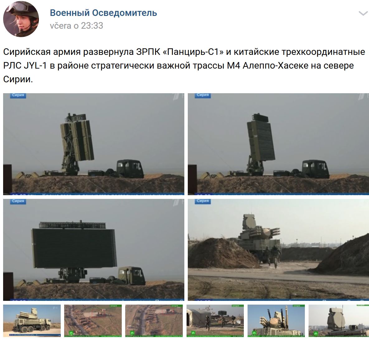 Sýrska armáda nasadila svoje PVO systémy krátkeho dosahu Pancir-S1 (Панцирь-С1) a čínsky 3-D radar JYL-1 v oblasti strategicky dôležitej diaľnice M4 Aleppo - Hasaka v severnej Sýrii (viď odkaz = trasa kopírujúca Sýrsko-Tureckú hranicu na severe).