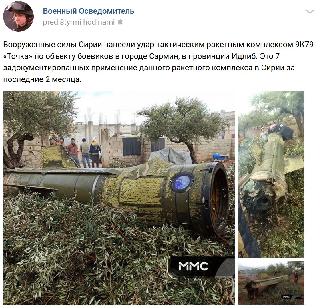Ozbrojené sily Sýrie zaútočili taktickým raketovým systémom 9K79 "Točka" (9К79 «Точка») na objekty militantov v meste Sarmin v provincii Idlib.
