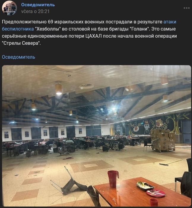Udajne bolo zranených 69 izraelských vojakov pri útoku dronu Hizballáhu v jedálni na základni brigády Golani. Ide o najvážnejšiu jednorazovú stratu na životoch IDF od začiatku vojenskej operácie „Šípy severu“.