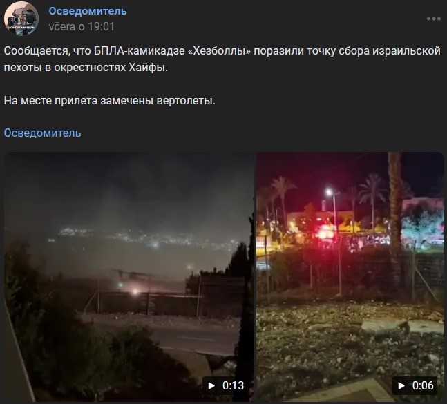 Údajne BPLA-kamikadze Hizballáhu zasiahli izraelské zhromaždisko pechoty neďaleko Haify. Na mieste príletu boli spozorované vrtuľníky.