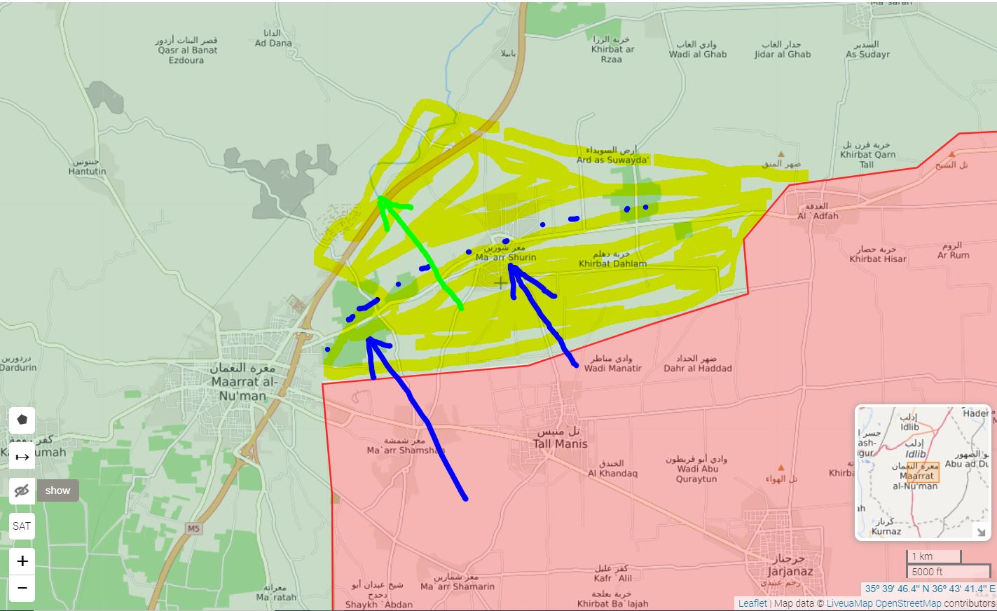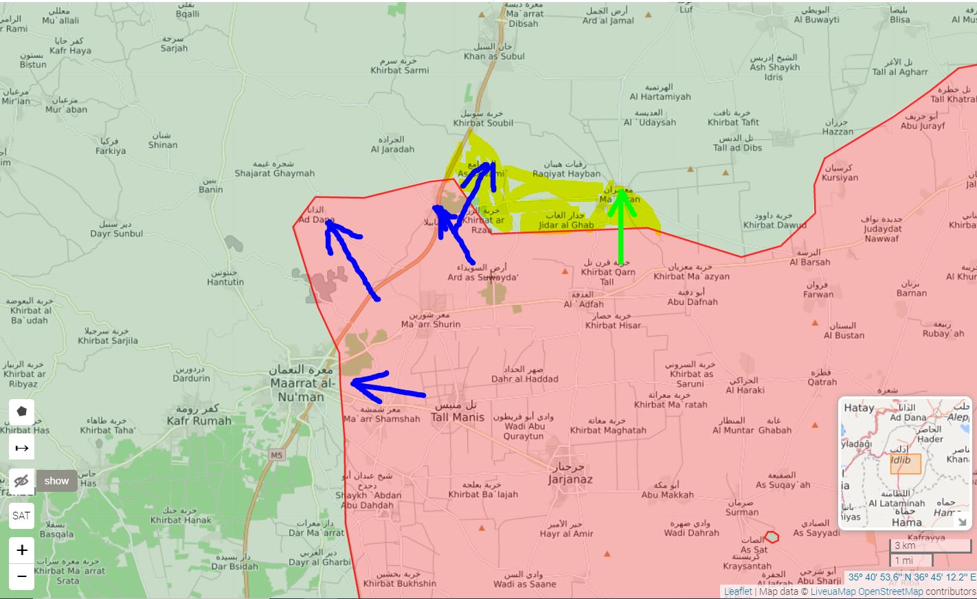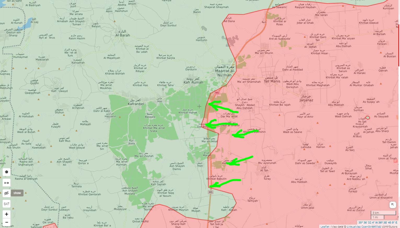 SAA+ kontroluje diaľnicu M5 Khan Shaykun - Marat Al Numan. Na severe pridala Khan al-Sabil