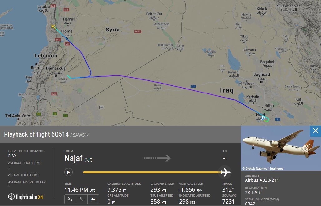 Trasa dopravného lietadla Airbus A320-211, registrácia 'YK-BAB' na pravidelnej linke do Sýrie so 172 ľudmi na palube a jeho odklon počas Izraelského útoku na Damask pomocou 4ks lietadiel rodiny F-16 a vypustených 8 strelách: Zdroj https://twitter.com/obretix/status/1225700709661757440 z 07.02.2020