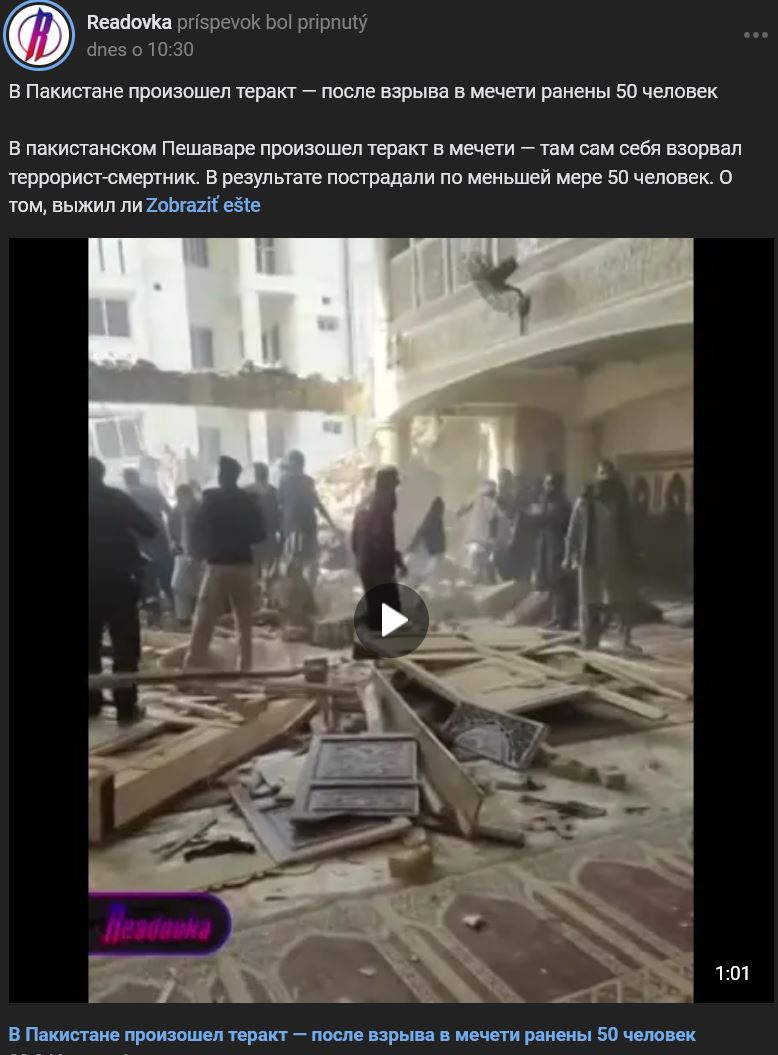 Samovražedný útočník sa odpálil v mešite v pakistanskom Pešávare. Najmenej 50 ľudí bolo zranených. Zatiaľ nie je známe, či útočník prežil. Mešita bola spojená s policajným zborom, takže útočník chcel pravdepodobne zabiť čo najviac ľudí. Zranených teraz prevážajú do nemocníc. K zodpovednosti sa zatiaľ neprihlásila žiadna skupina. Video https://vk.com/video-163061027_456286168 dĺžka 1:01 min.