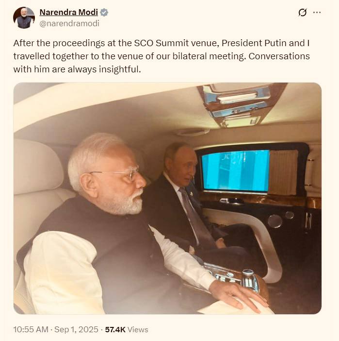 Jen o něco více než dva týdny poté, co se Vladimir Putin svezl v obrněné limuzíně Donalda Trumpa na začátku jejich summitu na Aljašce, se ruský prezident také " pouští do diplomacie na zadním sedadle " : tentokrát v Číně s indickým premiérem Naréndrou Módím.