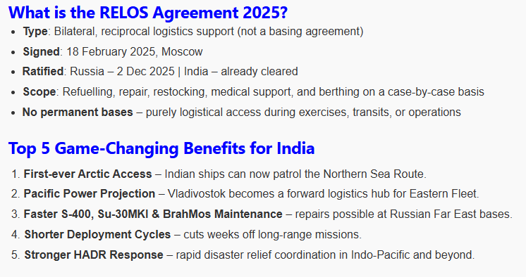 Dohoda o vzájemné výměně logistické podpory (RELOS) mezi Indií a Ruskem se vyjednávala deset let. Byla odložena za původní plánovaný termín dokončení, když premiér Narendra Modi navštívil Vladivostok v roce 2019; nakonec byla podepsána v únoru tohoto roku. Státní duma ji ratifikovala 3. prosince, den předtím, než prezident Vladimir Putin odletěl do Dillí na dvoudenní jednání s Modim.