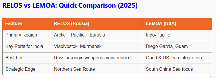 RELOS je sedmou indickou dohodou, která rozšiřuje globální námořní dosah Dillí a umožňuje indickému námořnictvu bránit přepravu strategických dovozů z Arktidy a Tichého oceánu kolem Číny a přes úžiny Jihočínského moře, Rudého moře, Perského zálivu a Indického oceánu.