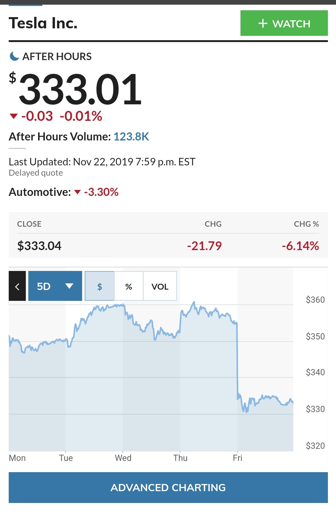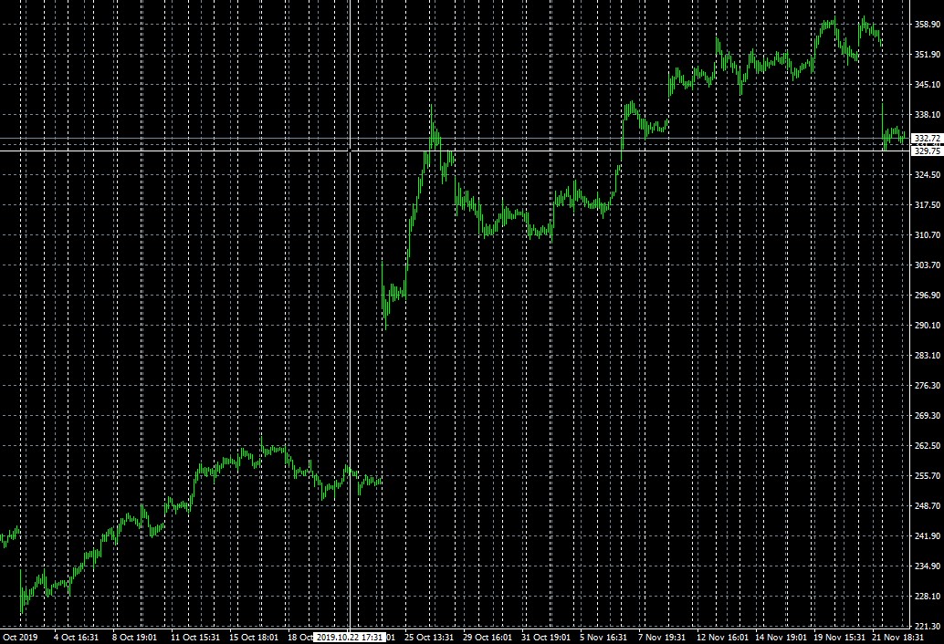 Tá Tesla teraz klesla na úroveň s pred dvoch týždňov a je stále o 100USD vyššie proti úrovni z 2.10.2019.