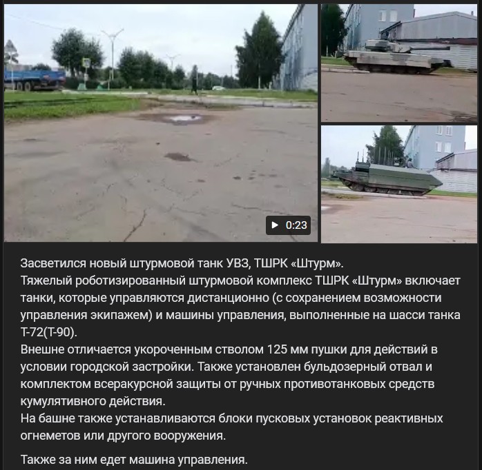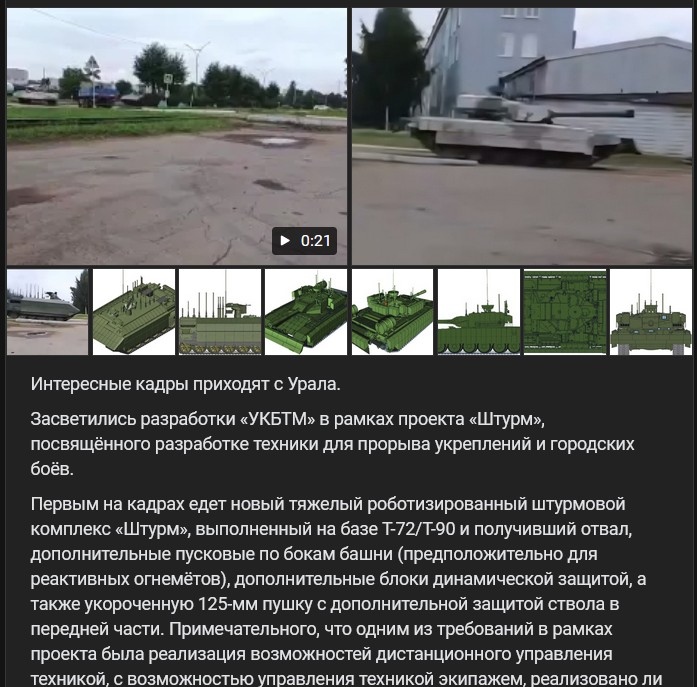 Vo všeobecnosti nie je úplne nový - generálny riaditeľ UVZ (УВЗ) v roku 2018 uviedol, že na základe objednávky MO RF vyvíja konštrukčná kancelária závodu na báze T-72B3 (Т-72Б3) útočný robotický komplex pre pouličný boj. Výskum a vývoj sa nazýva „Šturm“ (Штурм). Čo to je?