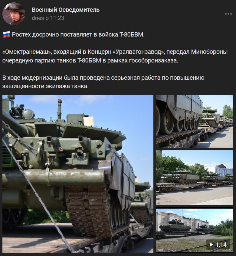 Ruská armáda rozšířila svou flotilu hlavních bojových tanků T-80 o novou várku modernizovaných a moderně pancéřovaných tanků T-80BVM dodaných dopravním strojírenským závodem Omsktransmaš. Tisková kancelář jediné ruské firmy vyrábějící tanky Uralvagonzavod informovala 14. února o poslední dodávce: "Omsktransmash odeslal ministerstvu obrany novou várku tanků T-80BVM. Modernizované tanky T-80BVM dostaly vylepšené reaktivní pancéřování, které výrazně zlepšuje ochranu posádky. Tanky navíc opouštějí území Omského dopravního strojírenského závodu s přídavným modulem ochrany věže, který byl odhalen na vojenském fóru Armáda 2023." Uralvagonzavod a Omsktransmaš byly dvě největší ze čtyř továren na výrobu tanků, které Rusko zdědilo po rozpadu Sovětského svazu, přičemž první vyráběla T-72 a jeho derivát T-90, zatímco druhá vyráběla nejschopnější tankovou třídu sovětské armády T-80. Nedostatečná poptávka po T-80 kvůli jeho mnohem vyšším výrobním a provozním nákladům však znamenala, že Omsktransmash rychle přestal být ekonomicky životaschopný a v roce 2004 byl pohlcen svým konkurentem.