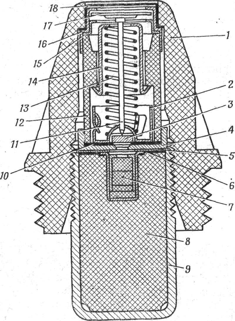 - pohyblivá miska 14 (v ruštine giľza = nábojnica) vplyvom zotrvačnosti prekoná silu pružiny 13 a zachytí sa v poistkovej miske 2