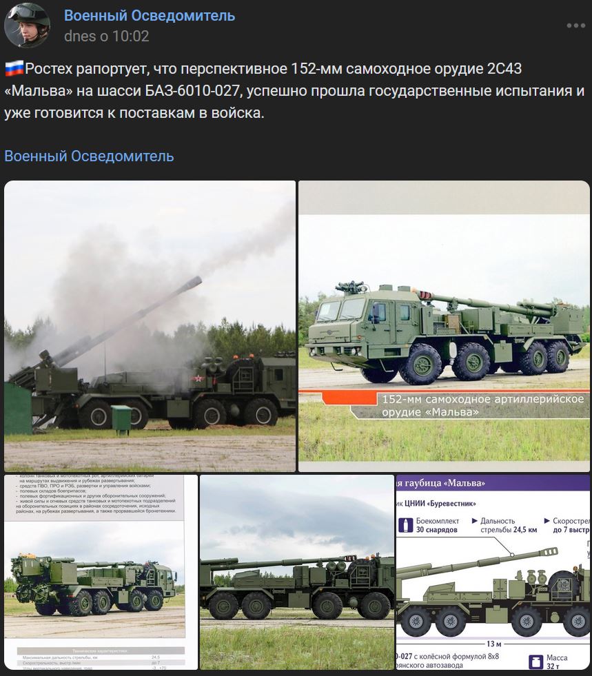 Rostech uvádza, že perspektívne 152mm samohybné delo 2S43 Maľva (2С43 Мальва) na podvozku BAZ-6010-027 (БАЗ-6010-027) úspešne prešlo štátnymi skúškami a už sa pripravuje na dodávku vojsku.