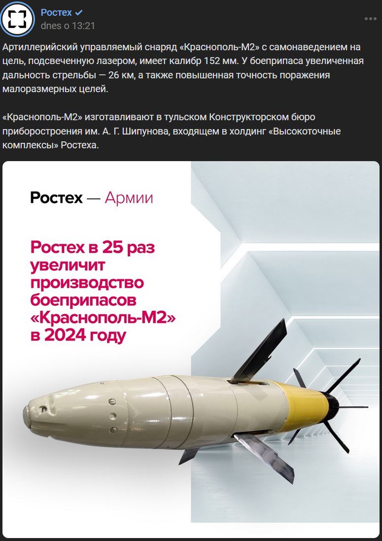 Delostrelecký navádzaný projektil Krasnopoľ-M2 (Краснополь-М2) so samonavedením na cieľ "osvetleného" laserom má kaliber 152 mm. Munícia má zvýšený dostrel 26km a zvýšenú presnosť pri zasahovaní malorozmerných cieľov. "Krasnopoľ-M2" vyrába v tulskej Konštrukčnej kancelárii pomenovanej po A. G. Šipunova (А. Г. Шипунова), ktorá je súčasťou holdingu "Vysokotočnyje kompleksy" (Высокоточные комплексы) Rostecha (Ростеха).