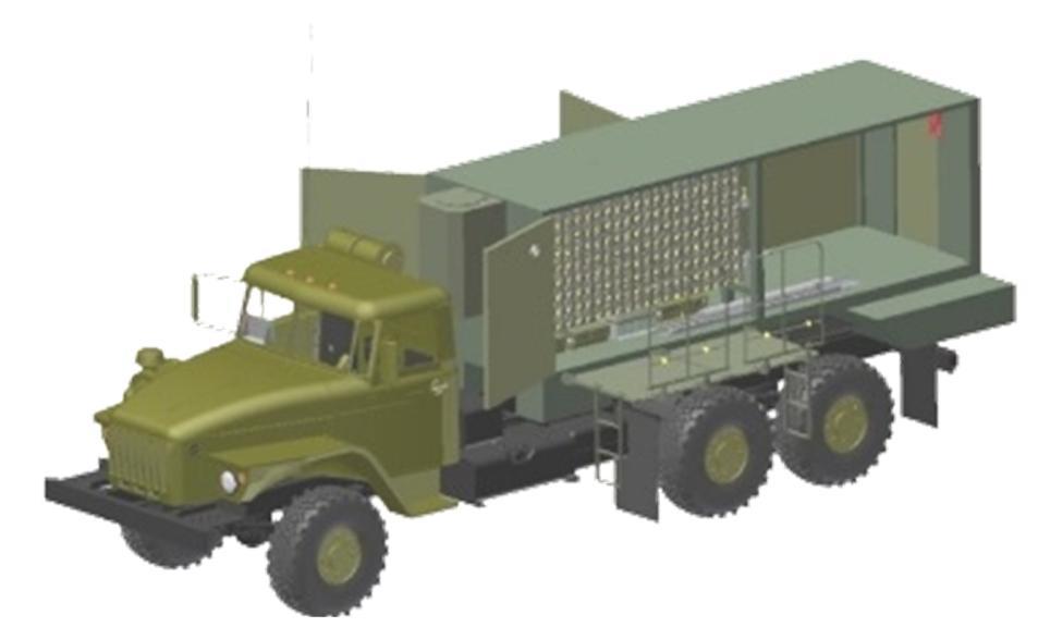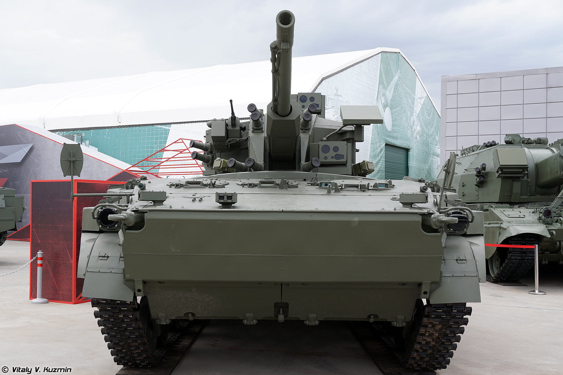 Derivace-PVO má nejspíš i nějaký malý částečně se do boků vyklápějící multifunkční radar, protože velice podobnou anténu má i Koalice-SV (v pozadí) a na co jí tak může mít? To v podstatě vylučuje to, že to je jen nějaká IFF anténa na té Derivaci - PVO prostředku (na vyloženě dělostřelecký systém by IFF určitě nedávali a ta anténa na Koalici-SV je tomu velice podobná a bude to mít stejný primární účel související s programovatelnou municí, jen se s ní nedá otáčet do boků ale dá se sklápět). Možnost je, že se tím krom jiného dá i na větší vzdálenosti měřit reálná rychlost vystřeleného granátu a možná i přes to ho přeprogramovat rádiově za letu do vzdálenosti pár stovek až jednotek km od vozidla (možná i podstatně více), teoreticky by to mělo poskytovat přesnější výpočty času inicializace granátu, než jen změření počáteční rychlosti granátu při opuštění hlavně a dalo by se to při výpočtech jednoduše kombinovat, kdy máte počáteční rychlost granátu při opuštění hlavně a jeho reálnou rychlost na úseku pár set metrů až km už s vlivem okolního prostředí na něj a podle i vcelku nepatrných odchylek, které okolní prostředí na něj způsobuje můžete ve výsledku počítat podstatně přesněji a dosáhnete přesnějších zásahů i jen s časově iniciovanou municí.