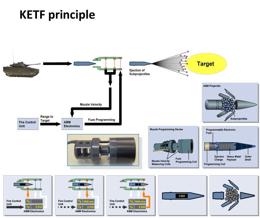 Co si pamatuji. O granátech s dálkově řízenou detonací se psalo v souvislosti s ráží 30mm. Jak dát starým kanonůn 2A42, 2A72 novou účinnost levnou modernizací bez zásahu do konstrukce zbraně, jen novým granátem a přidáním modulu na vozidlo s elektronikou a laserem pro dálkový odpal granátů. A pokud si to pamatuji dobře, tak bez potřeby toho indukčního programovatelnýho nástavce. Mělo to být levné řešení narozdíl od univerzální a drahý programovatelný pro různé mise. Jak jsem to pochopil, tak na dně granátu má být fotodetektor spojený se zapalovačem pro iniciaci po ozáření laserovým paprskem vozidla - nosiče zbraně. Jak to má zjistit přesnou rychlost každého granátu nevím, pravděpodobně nijak a bude se vycházet z průměrné počáteční rychlosti granátu.Alchymista píše: ↑01 črc 2021, 16:06-> čas 0:56 detail "úsťovej brzdy" - cievkový systém v nej je dosť zreteľne viditeľný.