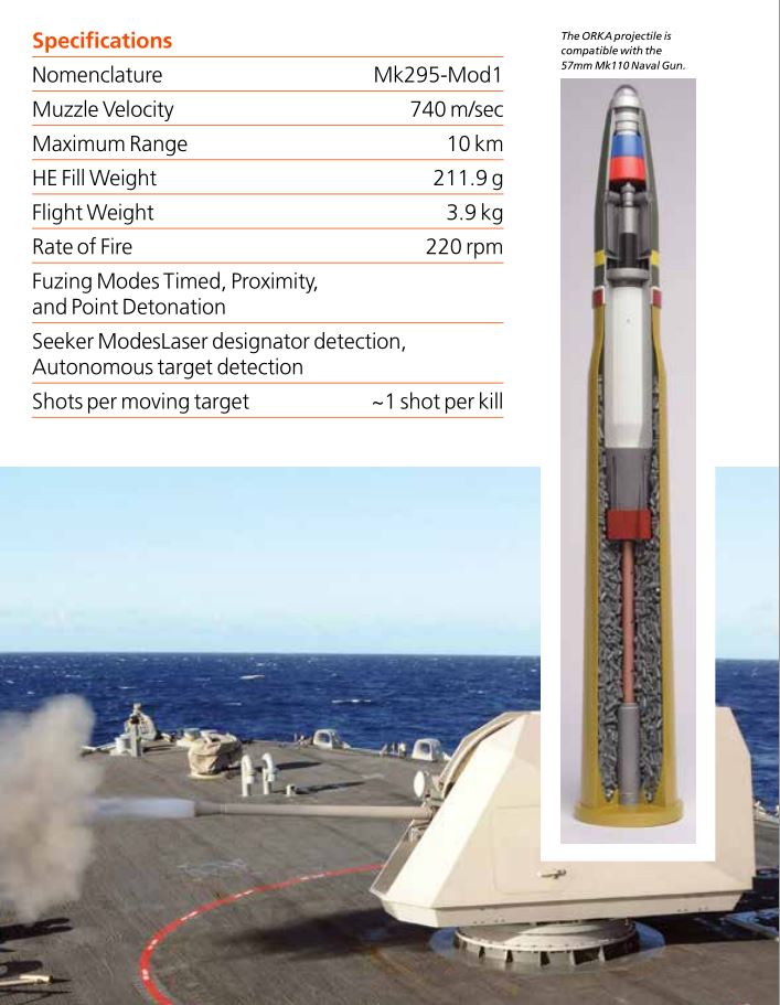 Tenhle řízený 57mm granát ORKA má naváděni EO a poloaktivní laserové. Má časový, nárazový a bezkontaktní zapalovač.