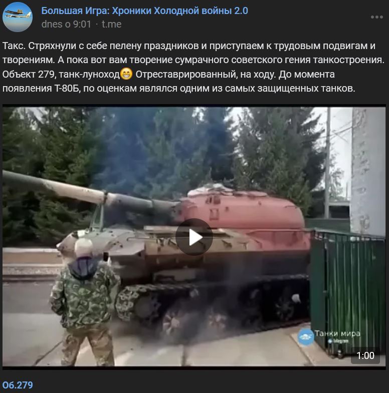 Tak sme sa zbavili závoja vianočných prázdnin a pristúpili k pracovným výkonom a výtvorom. Zatiaľ tu máme výtvor súmračného sovietskeho génia v oblasti stavby tankov. Objekt 279 (Объект 279), tank-lunochod. Zreštaurovaný, v pohybe. Až do zavedenia tanku T-80B (Т-80Б) sa odhadovalo, že ide o jeden z najlepšie chránených tankov.