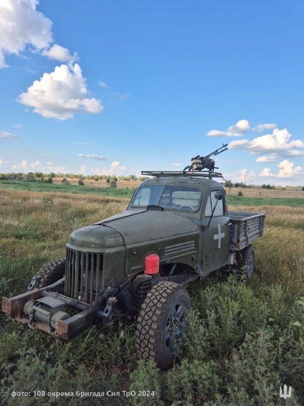 Ukrajinská technika, zmontovaná z toho, čo bolo v službe 108. samostatnej brigády územnej obrany. Rám a nápravy z obrneného vozidla "Kozak-2M",